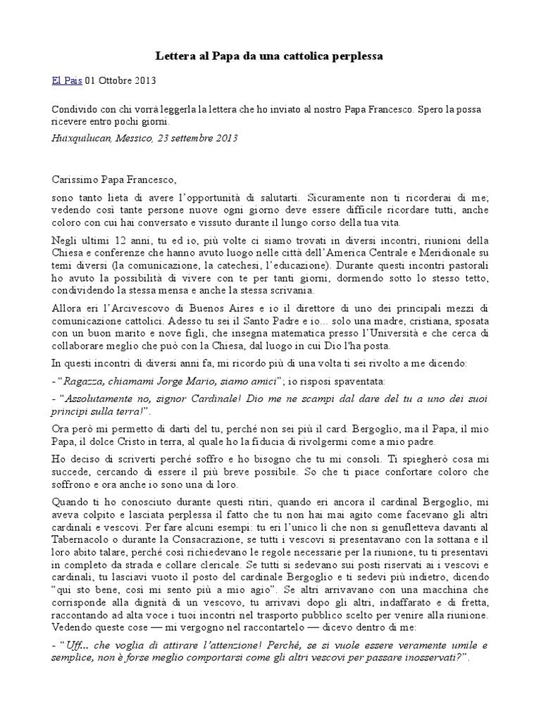 Lettera del papa ai giovani. Lettera di papa Francesco ai giovani dell'UNIV - Opus Dei Lettera di papa Francesco ai giovani dell'UNIV. Per il cinquantesimo anniversario dell'incontro universitario UNIV, papa Francesco ha inviato un messaggio ai partecipanti. Offriamo la lettera e la sua traduzione. in occasione del cinquantesimo anniversario di questo incontro universitario promosso dalla Prelatura dell'Opus Dei, venite ancora ... Papa Francesco a Loreto, ecco la lettera ai giovani - il Resto del Carlino La presenza di papa Francesco a Loreto sarà per e con i giovani. Il fulcro del suo arrivo, la fine del lungo percorso per i giovani e l'inizio verso il futuro della loro presenza nella Chiesa ... Lettera del Santo Padre Francesco ai giovani in occasione della ... Pubblichiamo di seguito la Lettera che il Santo Padre Francesco ha scritto ai giovani, in occasione della presentazione del Documento Preparatorio della XV Assemblea Generale Ordinaria del Sinodo dei Vescovi, in programma per l'ottobre 2018, sul tema "I giovani, la fede e il discernimento vocazionale". Lettera del Santo Padre Lettera del Papa ai giovani - SERVIZIO PER LA PASTORALE GIOVANILE E L ... LETTERA DEL SANTO PADRE FRANCESCO AI GIOVANI IN OCCASIONE DELLA PRESENTAZIONE DEL DOCUMENTO PREPARATORIO DELLA XV ASSEMBLEA GENERALE ORDINARIA DEL SINODO DEI VESCOVI Carissimi giovani, sono lieto di annunciarvi che nell'ottobre 2018 si celebrerà il Sinodo dei Vescovi sul tema «I giovani, la fede e il discernimento vocazionale».