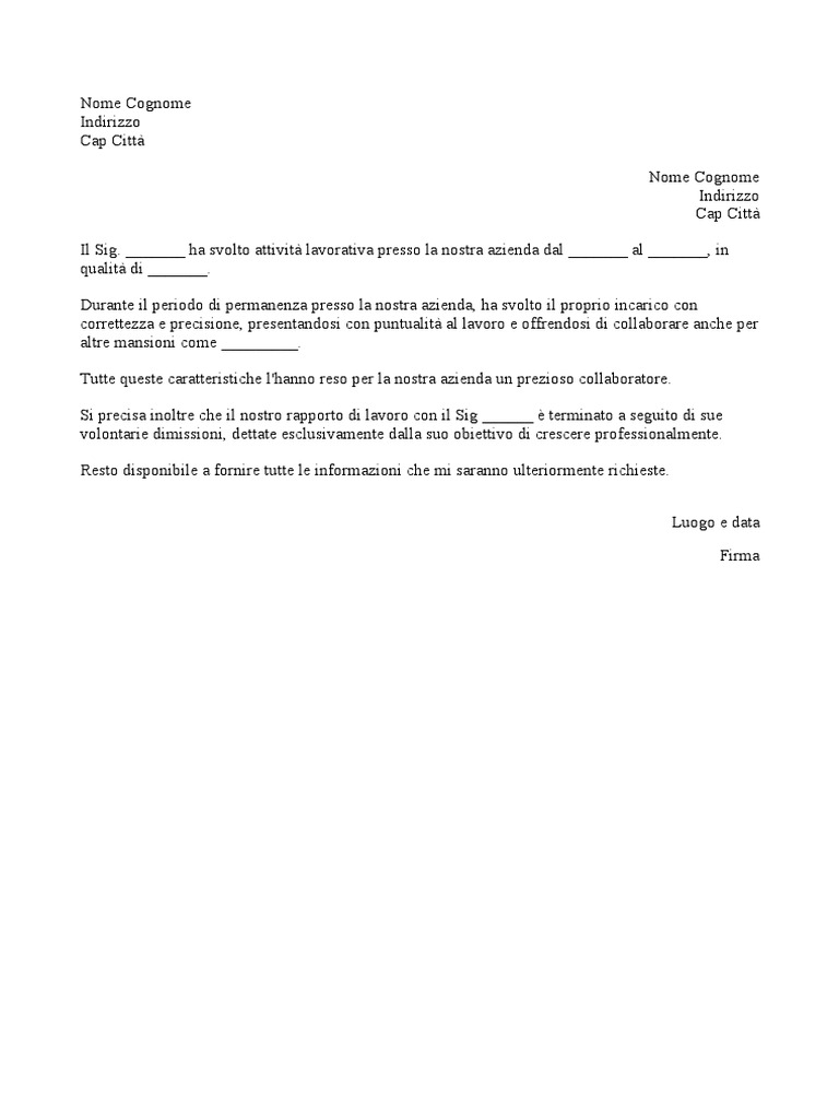 Lettera di referenze: modelli, strategie ed esempi - Mailsenpai Lettera di referenze: modelli, strategie ed esempi. Il mondo del lavoro di oggi è sempre più fluido e imprevedibile. Può capitare che un soggetto particolarmente qualificato sia costretto a cambiare posizione lavorativa per le motivazioni più disparate. Ecco a cosa serve la lettera di referenze o lettera di raccomandazione. Fac simile modello lettera referenze colf - Lettera43 Guide 1 cent La lettera di referenze viene redatta generalmente a fine rapporto dal datore di lavoro di una badante o di una colf, e serve a riassumere mansioni e competenze del lavoratore e si presenta...