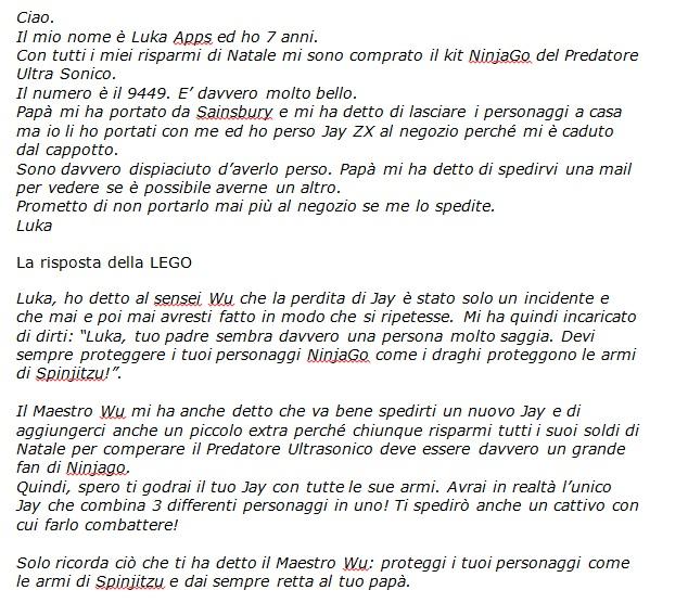 LEGO: la lettera al bambino di 7 anni impazza sul web 22 Jan 2013 — Il mio nome è Luka Apps ed ho 7 anni. Con tutti i miei risparmi di Natale mi sono comprato il kit NinjaGo del Predatore Ultra Sonico. Il numero ... Modelli di Lettera a Babbo Natale da Stampare Gratis Lettera a Babbo Natale 17 ciao sono Riccardo vorrei dei sacchetti per lego a selezionare,. pianetabambinit. Pianetabambini.it. 154mila follower. Christmas box con i Lego per la letterina a Babbo Natale Se volete far scrivere a vostro figlio una letterina un po' speciale per Natale, aiutatelo a costruire una Christmas box con i Lego.