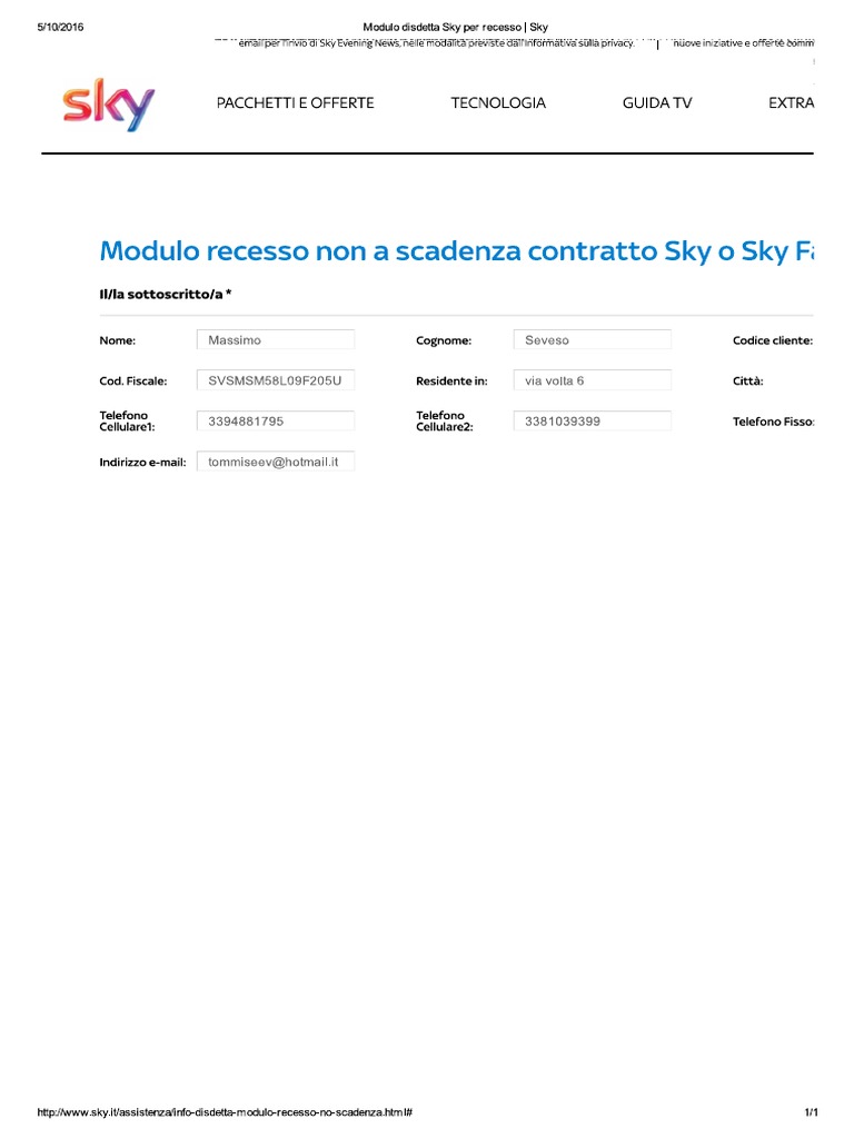› modulo-disdetta-linkem-5011Modulo disdetta Linkem: PDF e fac simile DOC per clienti privati Quali sono i costi previsti con la disdetta o il recesso Linkem. I costi variano a seconda che il cliente comunichi la propria volontà di far cessare il contratto immediatamente oppure al 24° mese. Per ogni dettaglio e approfondimento a riguardo, ti consigliamo di leggere il post che abbiamo dedicato alla disdetta Linkem. Fac-simile disdetta abbonamento Sky - Valoreazioni.com May 27, 2014 ... Di seguito proponiamo un fac-simile di lettera di disdetta da inviare a Sky per recedere dal contratto, da personalizzare a seconda del caso ... › modulo-disdetta-generico-14466Modulo disdetta generico: esempi DOC e procedura per ogni ... Jul 01, 2019 · Modulo disdetta generico: cosa deve contenere. Per fare in modo che la lettera di disdetta risulti efficace occorre seguire poche e semplici regole. Per prima cosa bisogna assicurarsi che contenga: i dati (compreso il codice fiscale) e i recapiti (indirizzo, e-mail, telefono) del mittente; DISDETTA SKY - MODULO E GUIDA Il modello della comunicazione, disponibile a questo indirizzo, deve essere inviato almeno trenta giorni prima della scadenza del contratto con l'ente ...