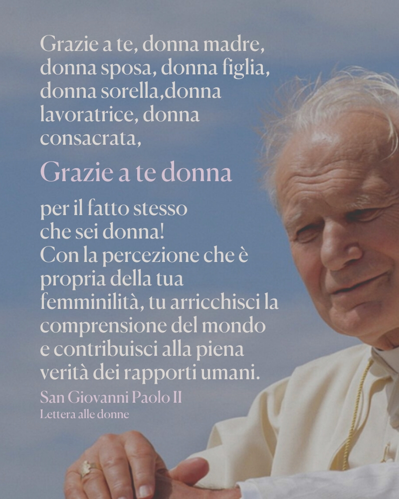 Auguri alle DONNE: lettera di Papa Giovanni Paolo II - LaEsseNews (Oltre a Auguri alle DONNE: lettera di Papa Giovanni Paolo II, leggi anche le altre news della rubrica DONNE). Grazie a te, donna-figlia e donna-sorella: he porti nel nucleo familiare e poi nel complesso della vita sociale le ricchezze della tua sensibilità, della tua intuizione, della tua generosità e della tua costanza. ...