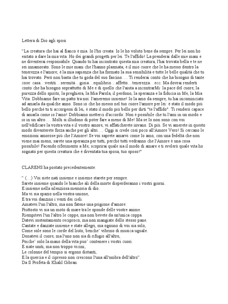 Lettera d'amore di Dio ad uno sposo - YouTube Dec 13, 2013 ... Adattamento di "Lettera d'amore di Dio agli sposi" di Padre Giordano Muraro.Padre Giordano Muraro, nato nel 19.., domenicano, ordinato nel ... Lettera d'amore di Dio agli sposi LETTERA D'AMORE DI DIO AGLI SPOSI. Dio ti disse il giorno del vostro sposalizio: La creatura che hai al tuo fianco, emozionata, è mia. Io l'ho creata.